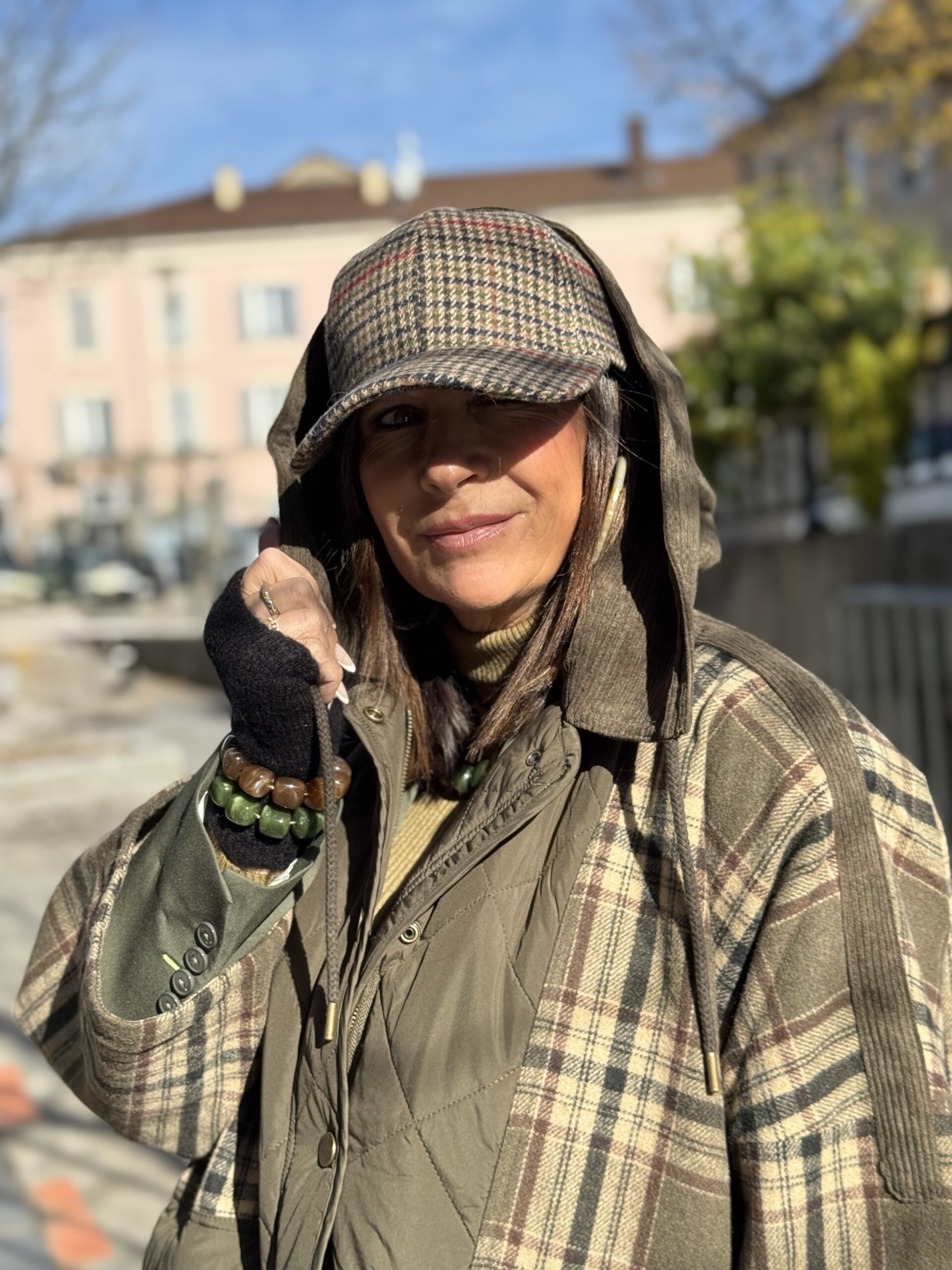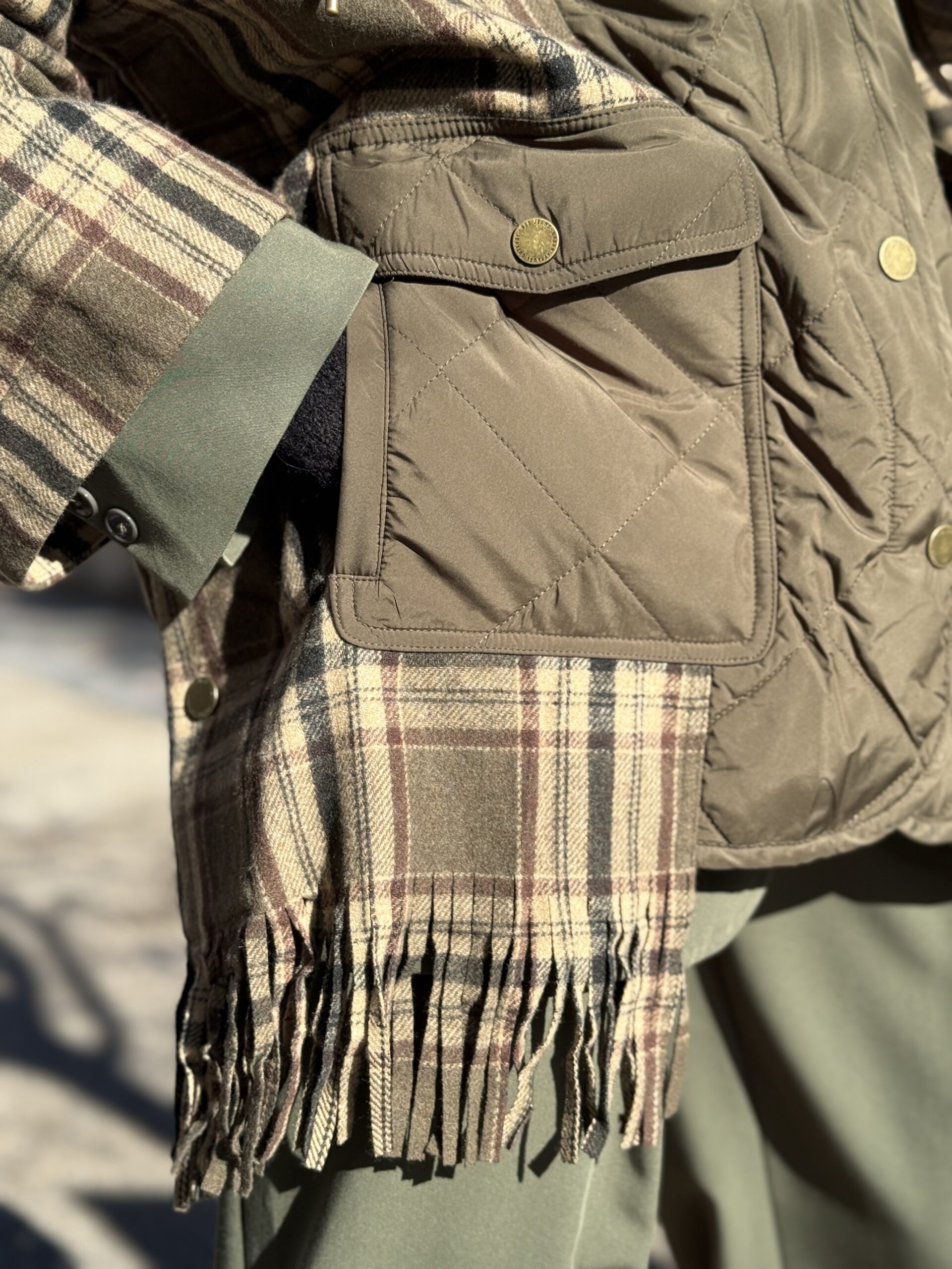 Alliant style rétro et confort moderne, cette veste oversize matelassée à carreaux kaki est la pièce cocooning parfaite pour affronter les journées fraîches avec allure !