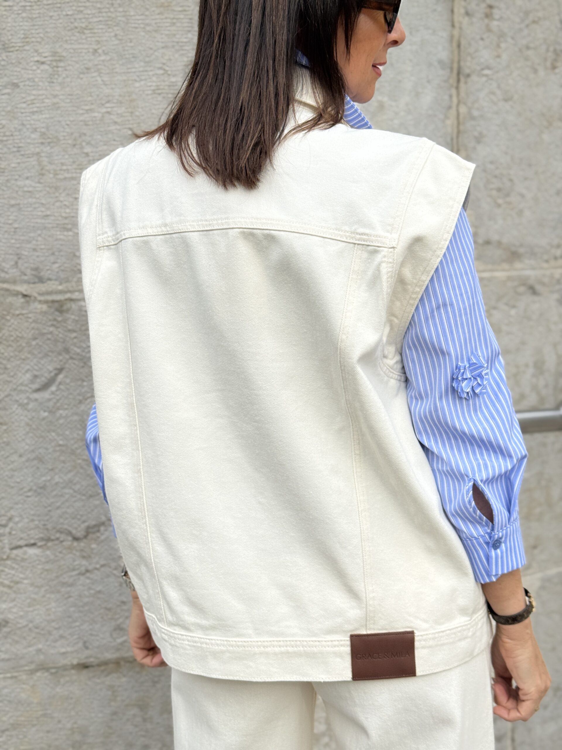 Graphique et élégante, la veste sans manches « Vallonia » revisite le tailoring avec modernité. déclinée dans un écru uni lumineux, elle apporte une touche épurée et intemporelle à la silhouette.Sa coupe droite structurée et son col montant soulignent une allure contemporaine et affirmée.