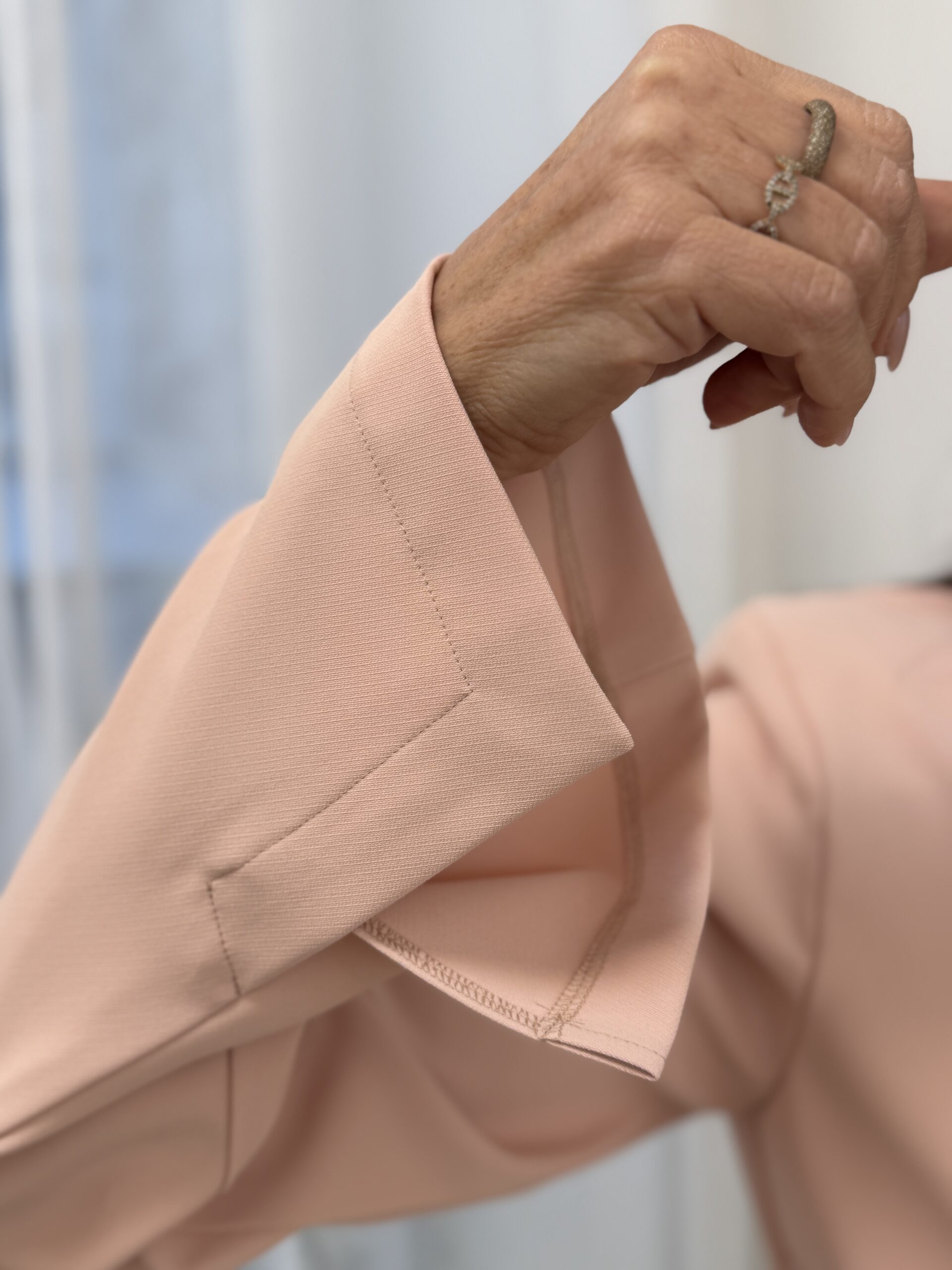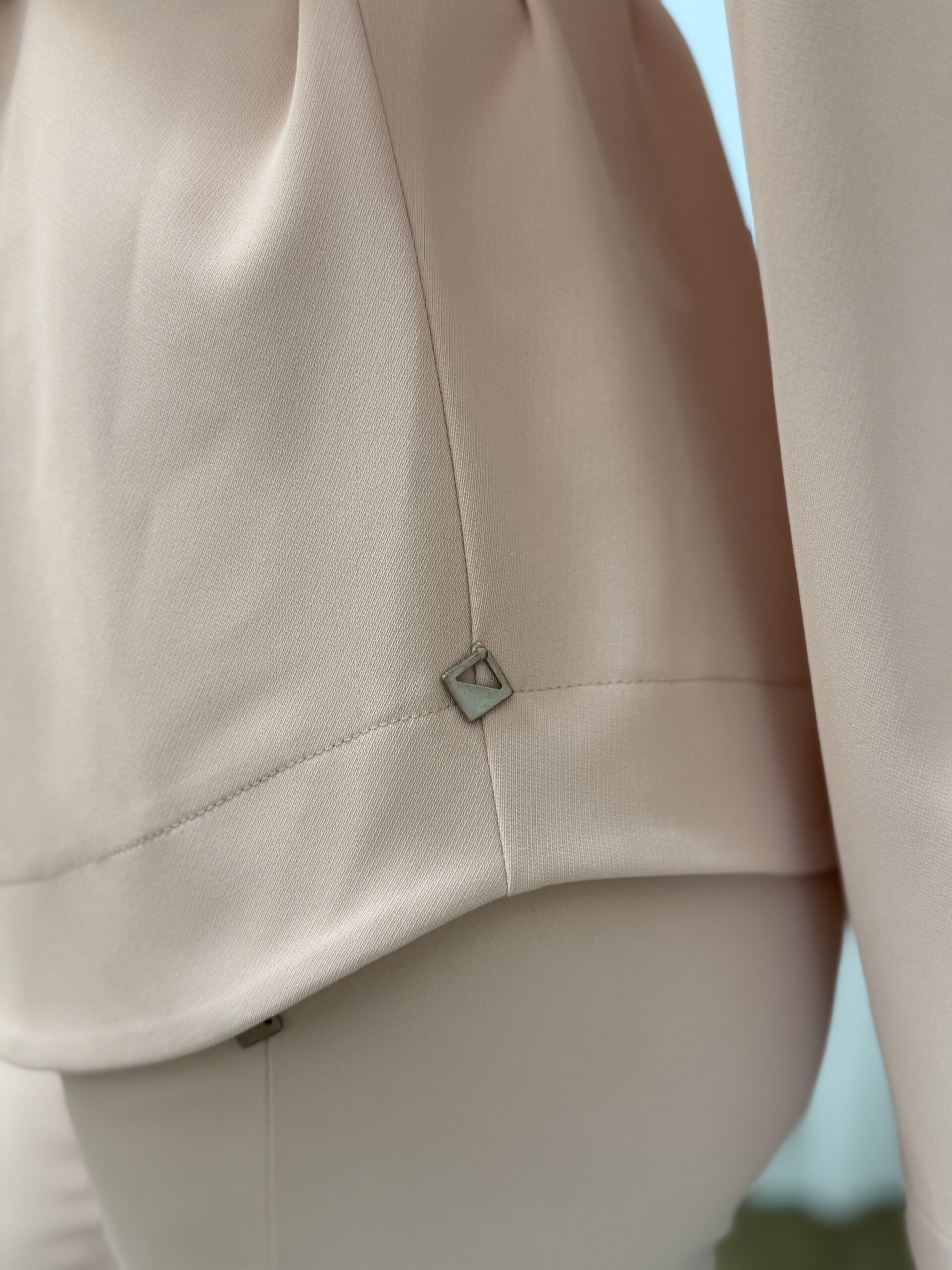 La veste chic par excellence. Coupe fluide, taille marquée et sa teinte nude ultra élégante. Elle allonge la silhouette et donne tout de suite une allure sophistiquée.