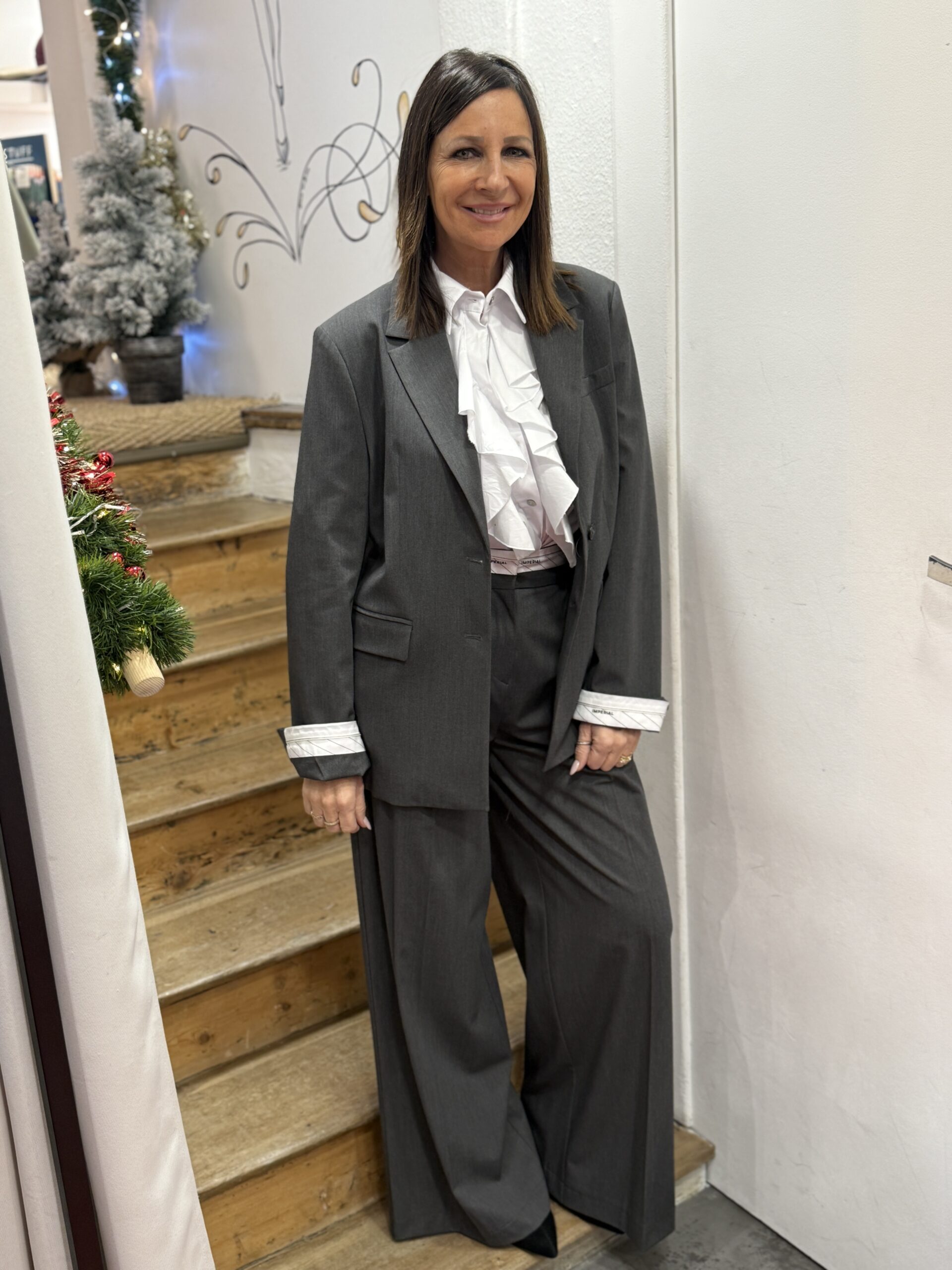 Conseil mode de Nathalie : Porte-la avec la chemise blanche à volants  et le pantalon large assorti, pour un power suit féminin et moderne, idéal au bureau comme en soirée.